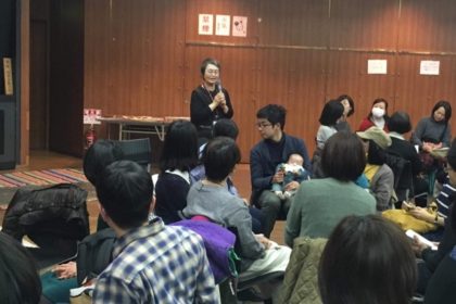 上映会の後は、グループに分かれて映画の感想のシェアリングと深津高子さんによるミニトーク。「子育ての素晴らしさを映像で表現してくれた」、「想像以上に濃い内容で何度も見たい」、「自分の子育ての肯定された気がする」、「家族で観て夫と深く話すことができた」、「子育てはみんなでできる!」、「セッティングには子ども連れにも優しい工夫があって良かった」等の感想をいただきました。