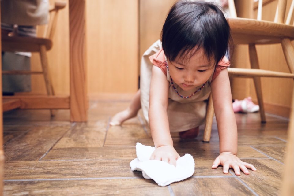 ぞうきんで拭く拭き方・絞り方。ちりとりで掃く掃き方。できるだけ子どもの手に合うサイズの道具がおすすめ。