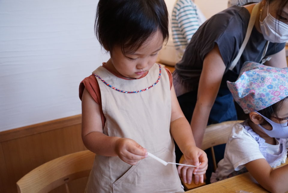 大人のスピードではなく、子どもに合ったスピードで「やってみせる」。このスピードは想像以上にゆっくりで、言葉がけをせずに見せることだけに集中する。それを見ている子どもの真剣な眼差しが印象的です。