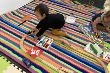 子どもの年齢に合わせて子どもスペースで見守る大人の数を決めて、おもちゃも選びます。今回は木のレールと汽車。レポーターの子どもが当時、夢中だったおもちゃが活躍しました。