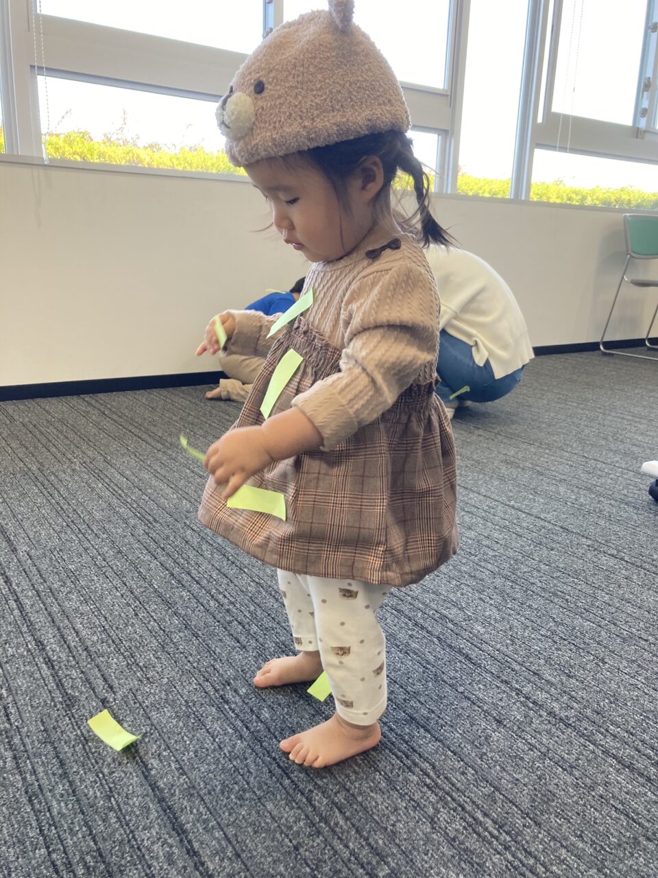 そこで、小さい地図をスタッフが渡してあげたら、最初はペンでお絵描き。そこへ、大人と同じように付箋を貼ってみたいかなーと地図に貼って見せたら、付箋にお絵描きして貼る、剥がしてみる。付箋を貼って剥がすことが楽しくなってきて、すぐに地図はいっぱいに。そのままの勢いでお互いに貼り合っちゃいました♫とっても楽しそうでした。